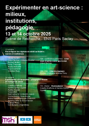 La Scène de recherche a le plaisir d’accueillir un colloque organisé par Audrey Gosset, normalienne agrégée et attachée temporaire d’enseignement et de recherche à l’ENS Paris-Saclay. Pour la mise en place de cette journée, elle est accompagnée de Victor Thimonier (Maître de conférence en études théâtrales à l’Université d’Évry - Paris-Saclay et artiste associé à la Scène de recherche) et Morgan Chabanon (Maître de conférence à CentraleSupélec).