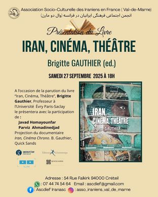À l'occasion de la parution du livre "Iran, Cinéma, Théâtre", Brigitte Gauthier, Professeur à l'Université Évry Paris-Saclay le présentera avec la participation de Javad Homayounfar et Parviz Ahmadinedjad.